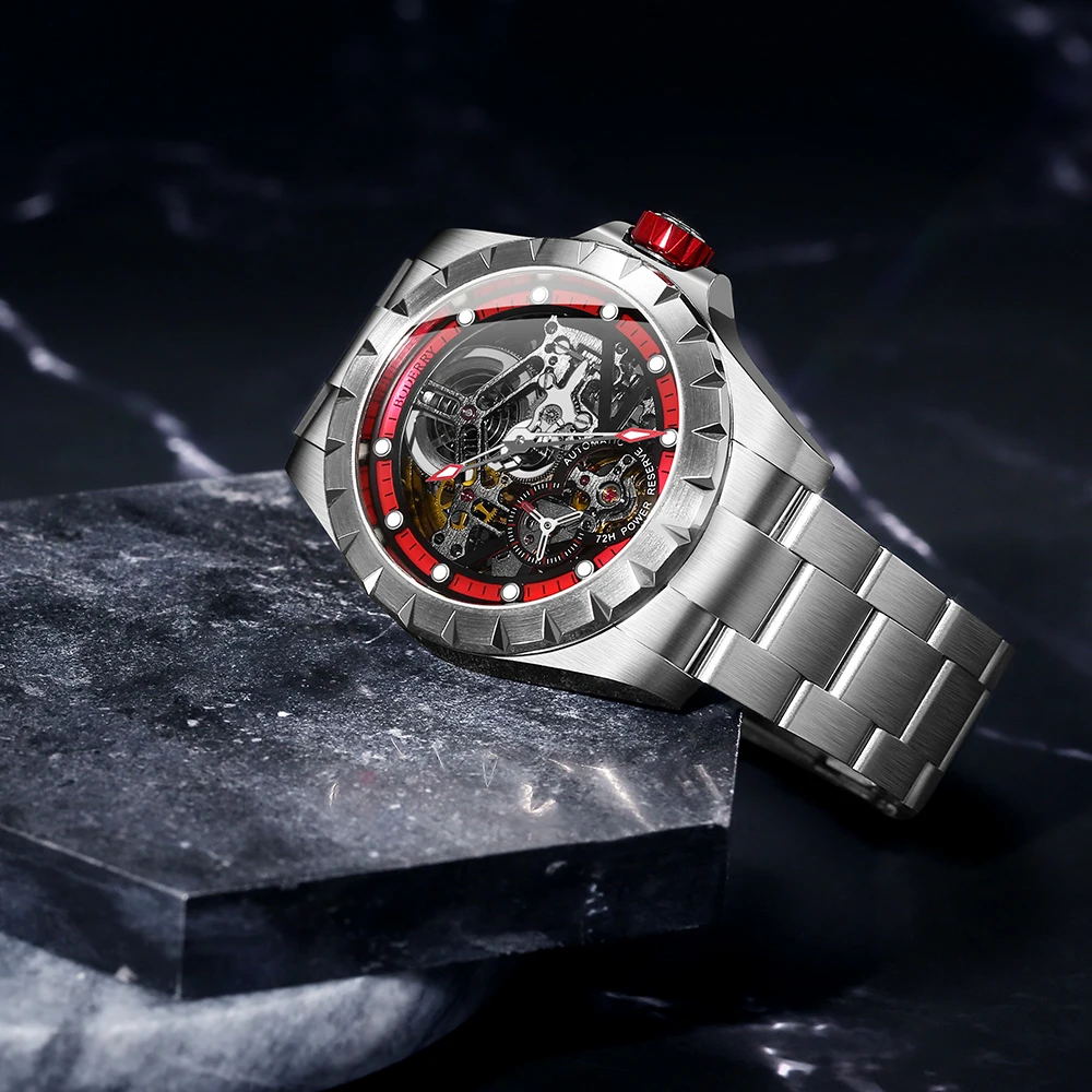 The "OPEN HEART" skeleton aesthetic gives a glimpse into the intricate details and superior machinery behind this sophisticated timepiece. Each watch is made from surgical-grade 316L stainless steel and features a sapphire crystal mirror, making it built to last and withstand everyday wear and tear.