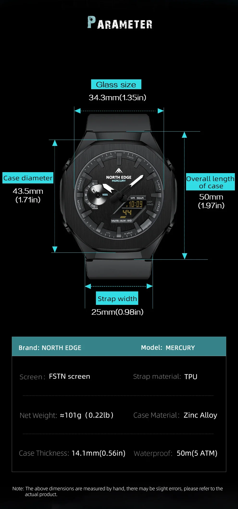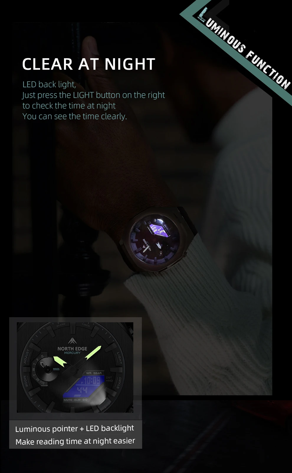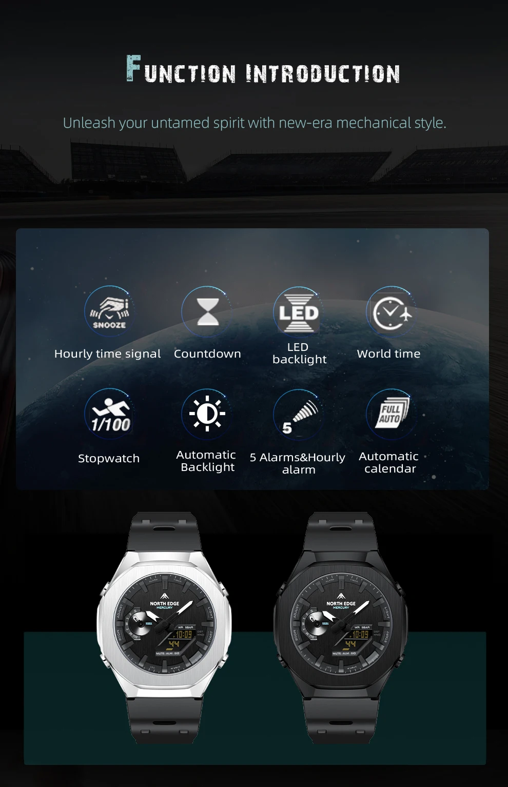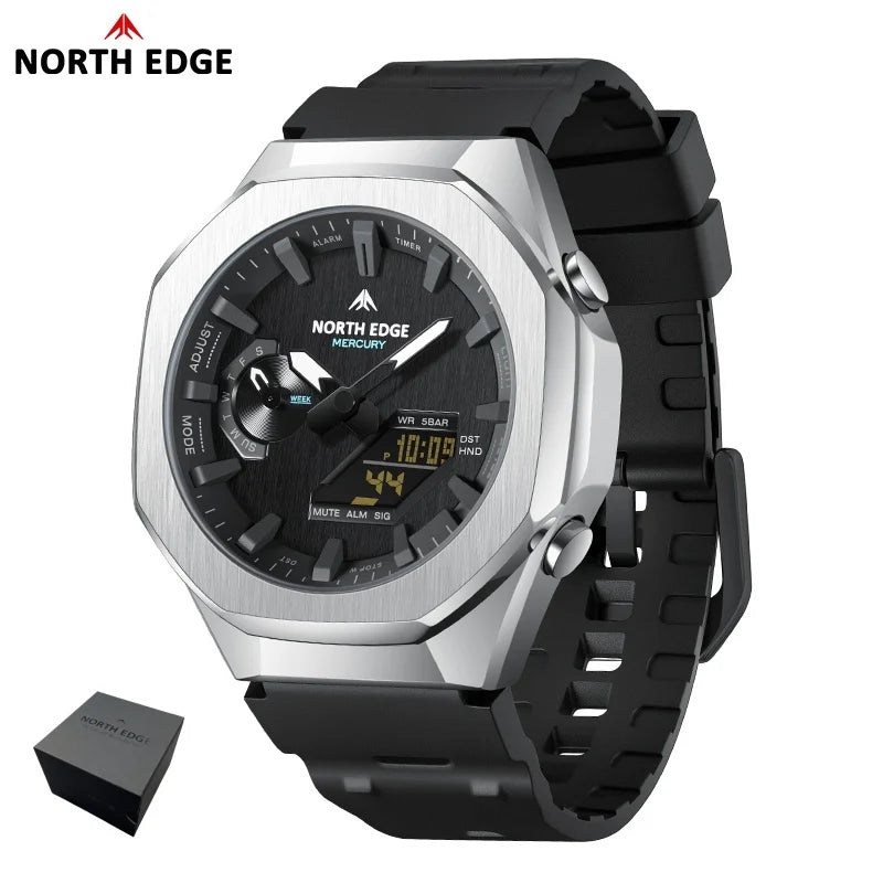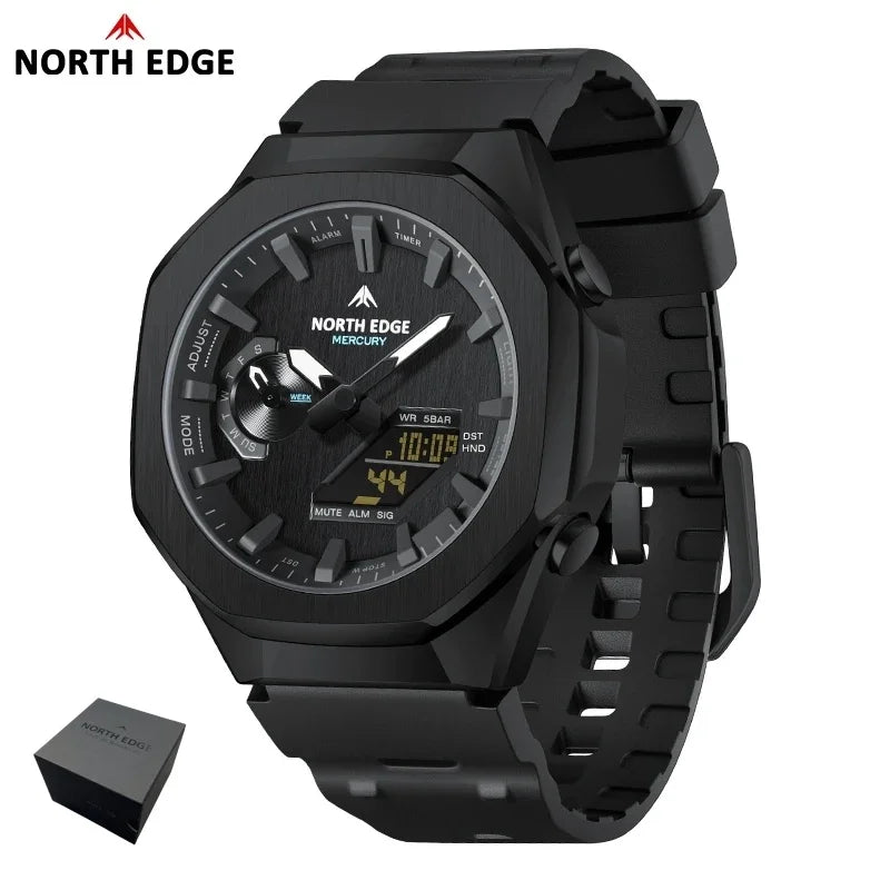 Stay on schedule wherever you go with the NORTH EDGE MERCURY, a high-performance digital wristwatch designed for athletes, travelers, and outdoor enthusiasts. With a durable zinc alloy case, TPU strap, and 50M water resistance, this watch is ready for action in any environment.