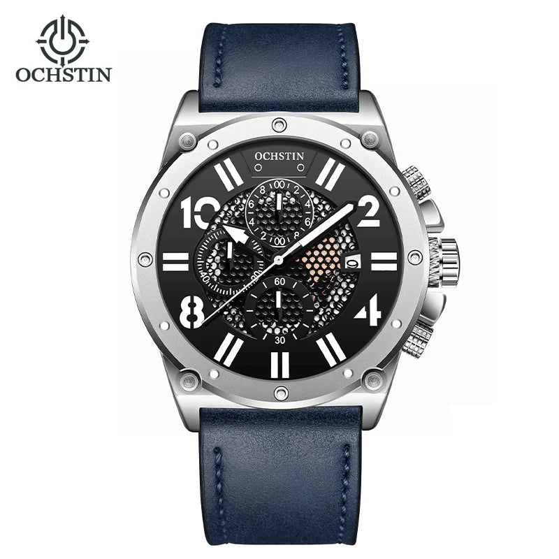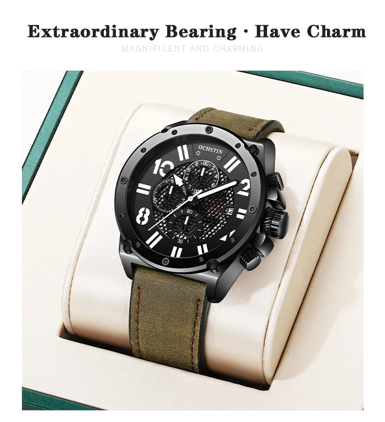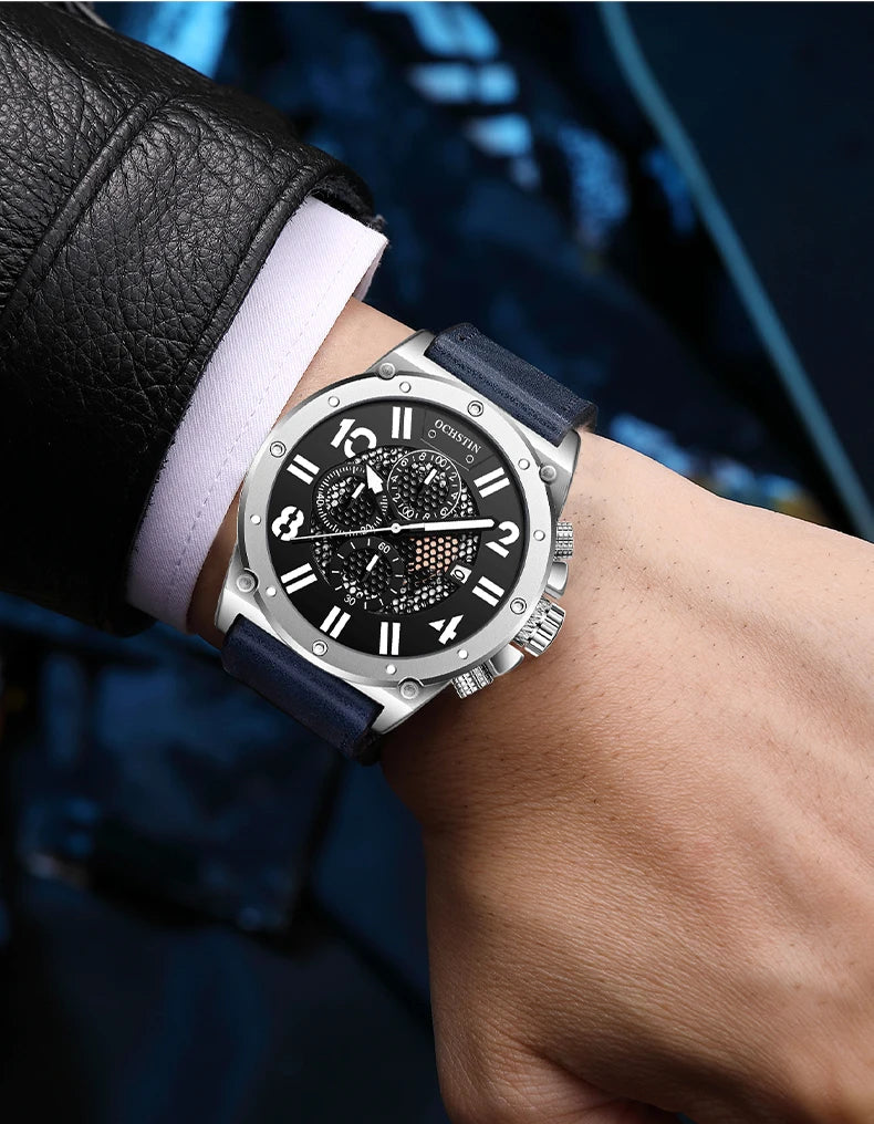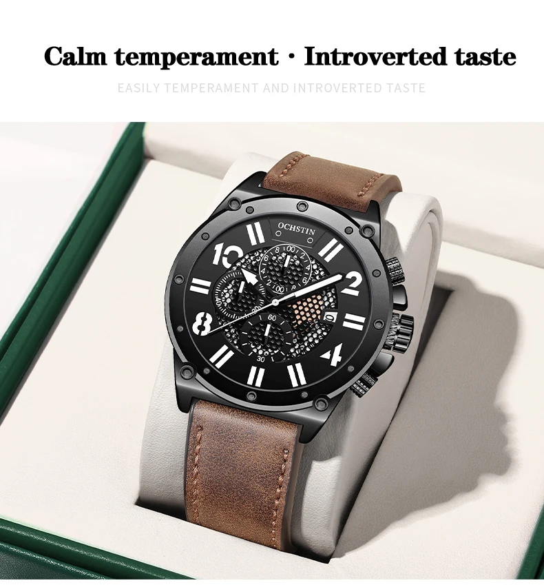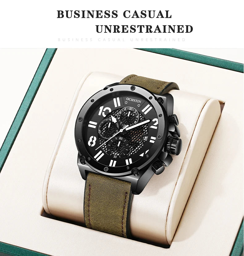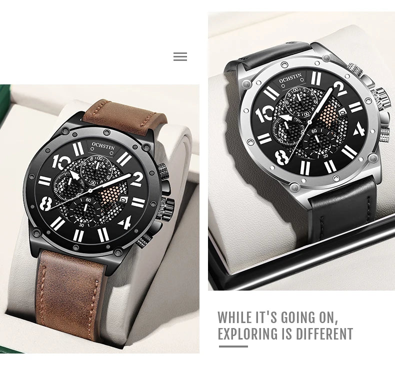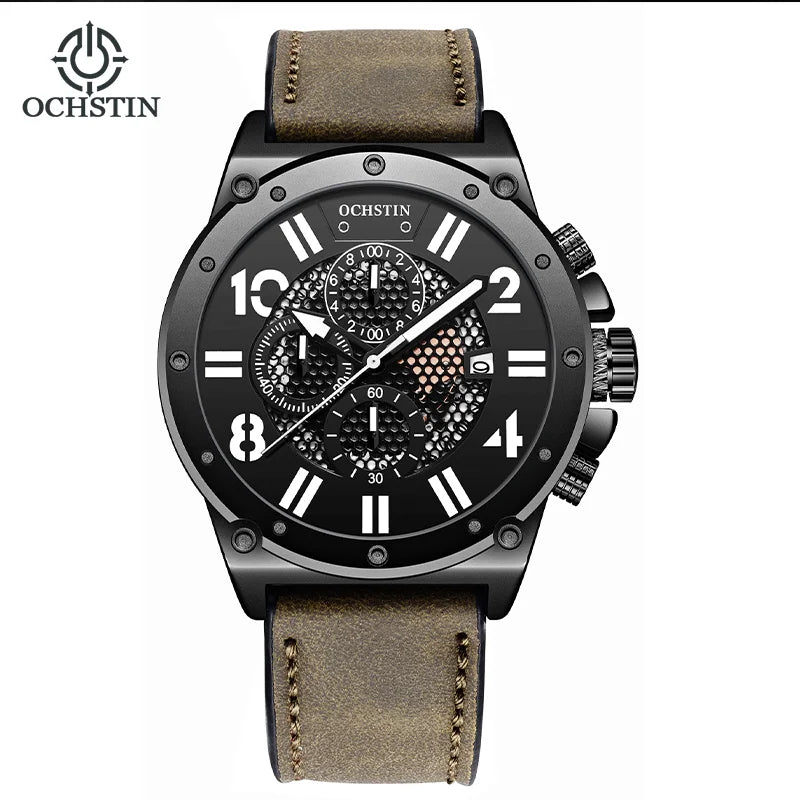 OCHSTIN Men’s Quartz Watch – Waterproof, Leather Strap, Luminous Hands, Multifunction Chronograph