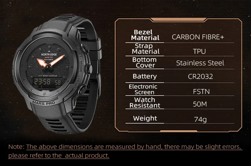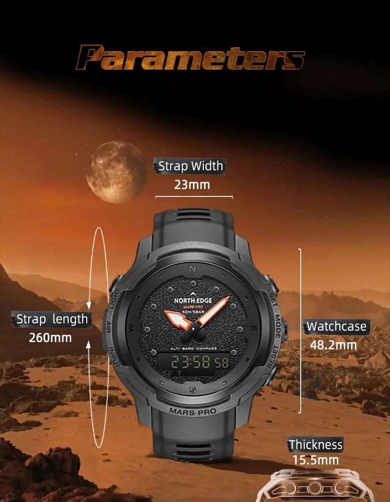 The NORTH EDGE MARS Pro is a rugged, multifunctional digital watch designed for outdoor enthusiasts, military use, and adventure seekers. It features a carbon fiber case, altimeter, barometer, compass, and 50M water resistanc