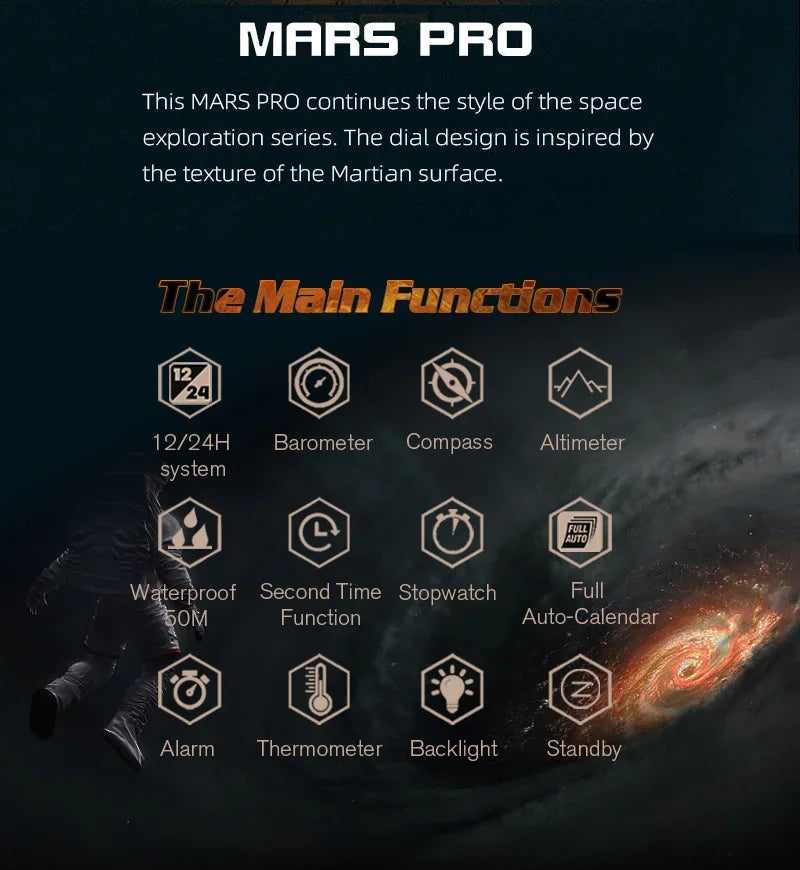 This MARS PRO continues the style of the space exploration series. The dial design is inspired by the texture of the Martian surface.